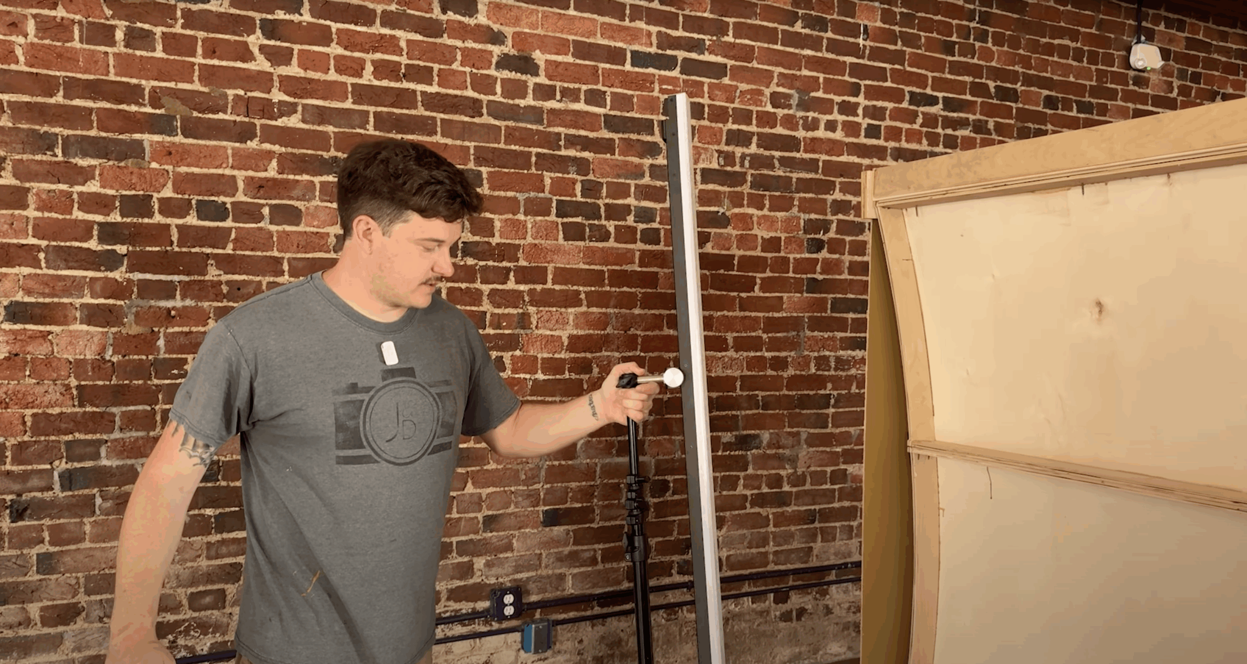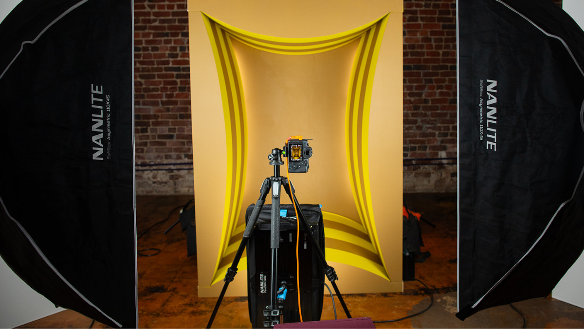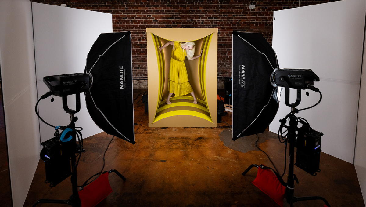 David positioned Nanlite LED bars and strobes to evenly light the set while keeping cords tightly managed and the footprint small. By pairing a V-flat on each side to bounce light, he achieved a clean, high-key look while maintaining safety and organization.