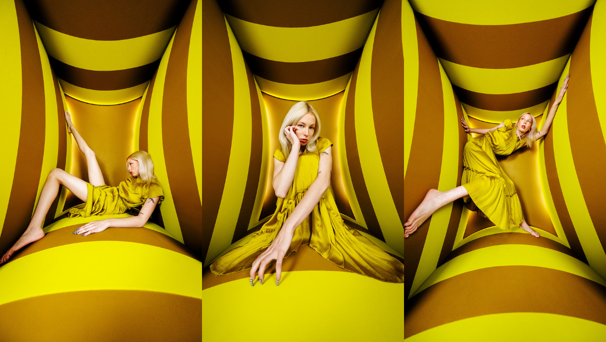Their “do it yourself” set was built from scratch, reinforced with jacks and sandbags to ensure safety for the model performing dynamic poses inside the curved structure. This thoughtful preparation built the trust necessary for the creative energy that followed.