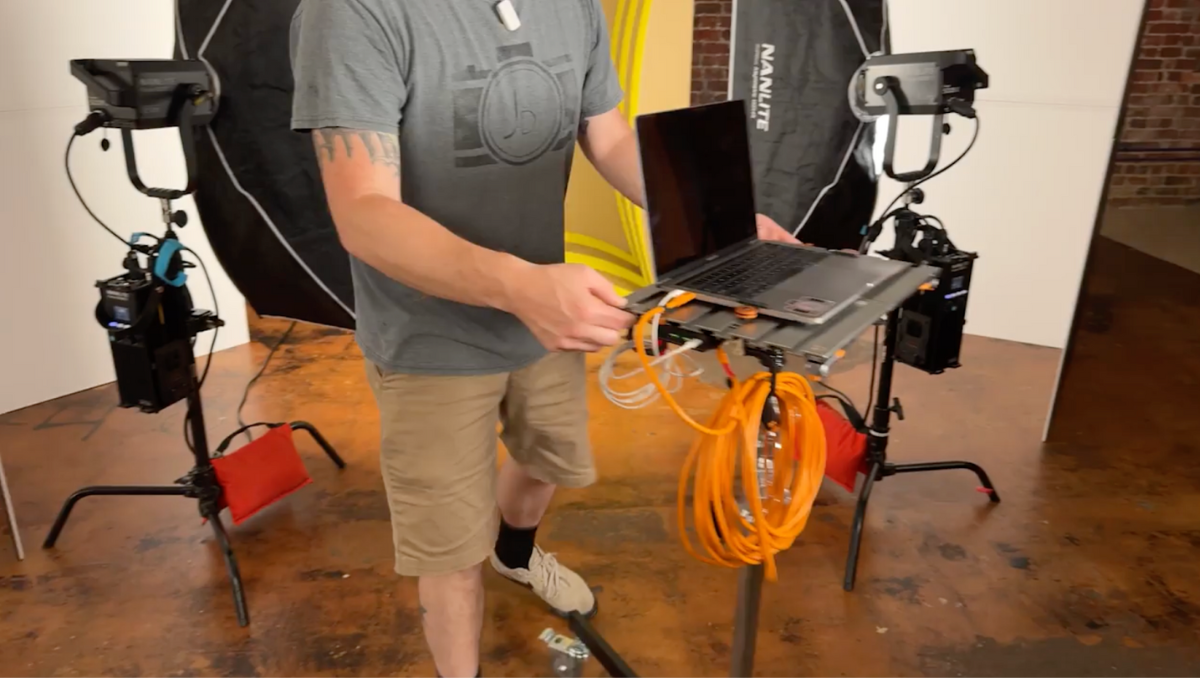 David’s favorite part of the setup? The AeroTrac Workstation System. It’s their on-set command center—a portable photography workstation that brings power, organization, and tethering together.