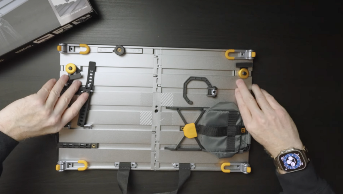The AeroTrac’s foldable aluminum design and track-based accessory system allow creators to mount the tools they need exactly where they need them — from hard drives and power banks to cameras, monitors, and even coffee cups.