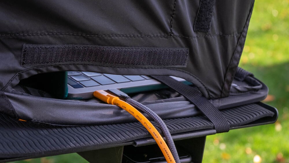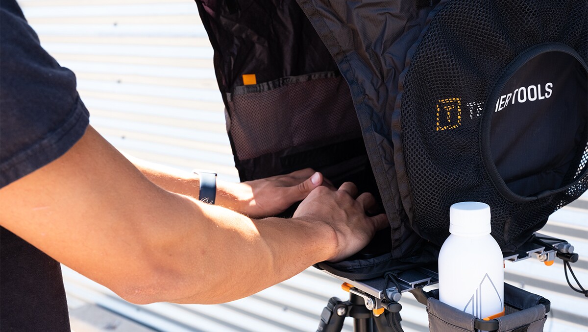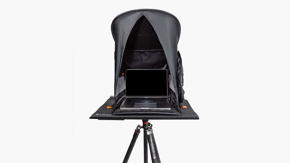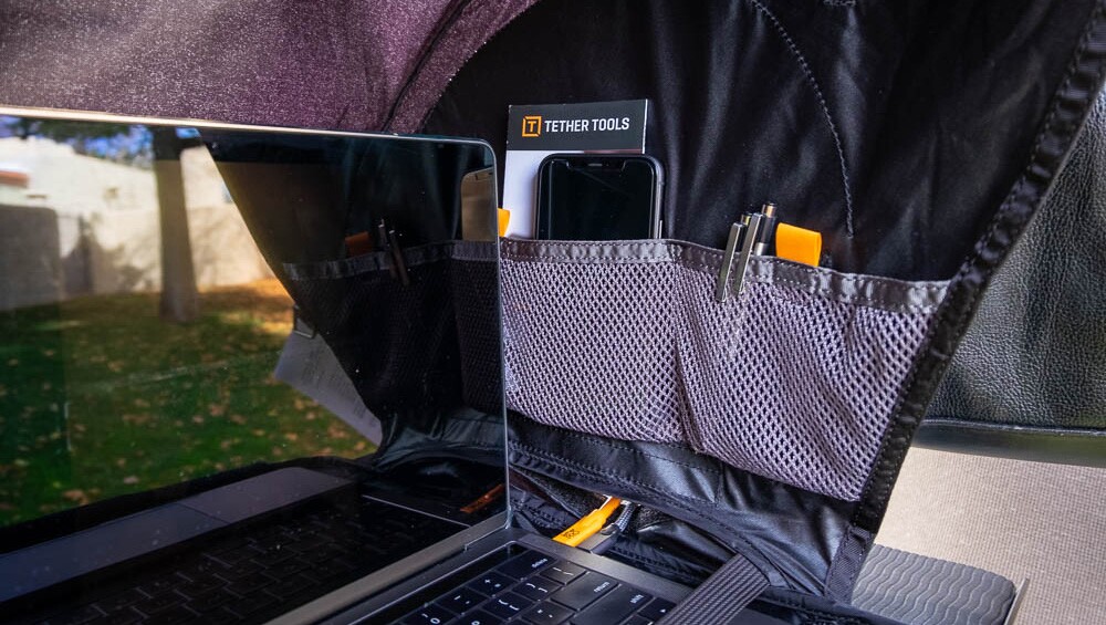 Too much sunlight makes it difficult to view photos on a laptop, tablet or monitor. The Aero Sunshade provides a dark viewing area if you’re on location. In addition, the Aero Sunshade can be easily secured to to any laptop platform such as the AeroTrac, Tether Table or many other platforms using the built-in Secure Strap connector. Need to block out all sunlight? The built-in pullover hood provides total privacy, complete light block-out and protection from natural elements like dust and sand in extreme locations or challenging weather conditions. The Aero Sunshade folds up and self-secures in its own pouch and has a handle for easy transportation and storage. Don’t go on location without it!