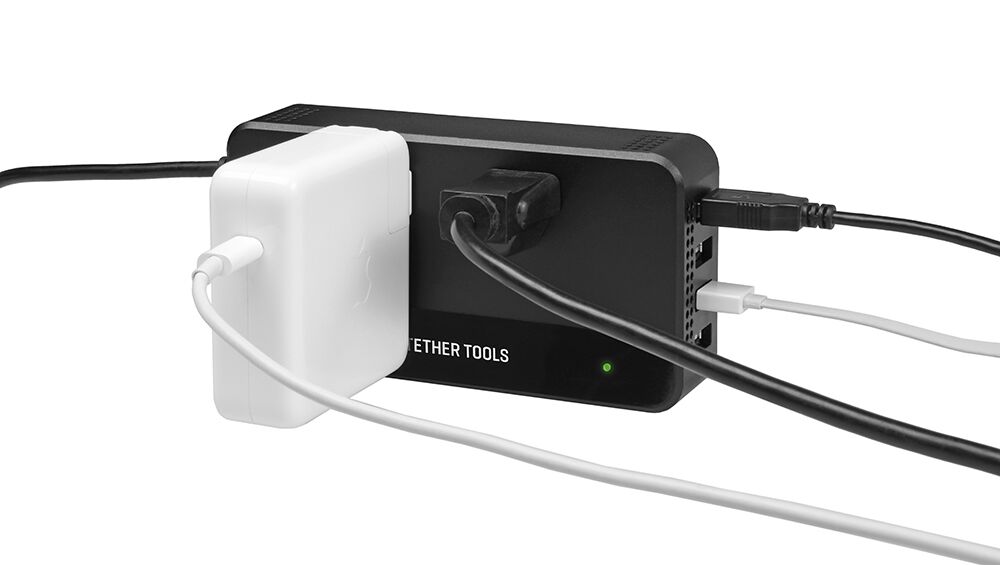 - Two AC outputs and four USB ports powered from any battery with a D-Tap connector including V-Mount and Gold Mount Batteries