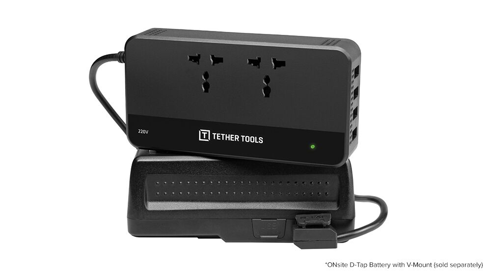 The ONsite Power Solution is an ultra-portable, long-lasting, and versatile power solution anchored by the ONsite D-Tap to AC Power Supply. A first of its kind product, the D-Tap to AC Power Supply pairs with any battery with a D-Tap connector (including V-Mount and Gold Mount Batteries) to create two AC outputs and four powered USB ports.