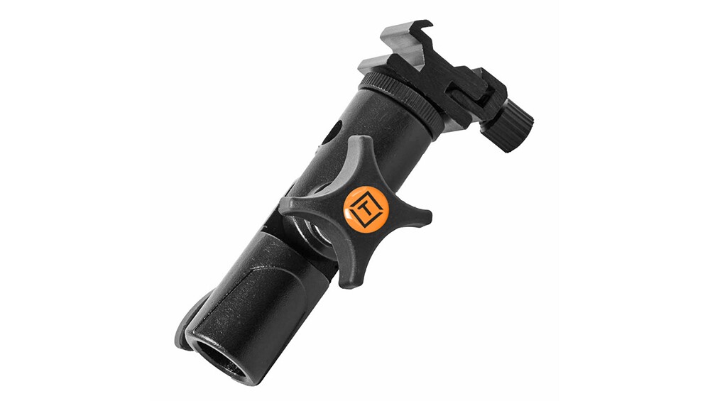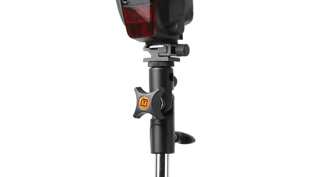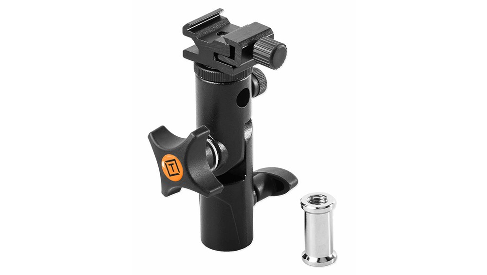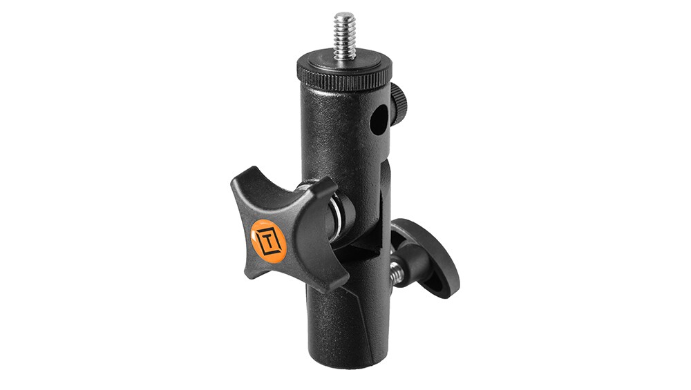 A versatile cold shoe mount that allows photographers to mount any speedlight to a lightstand, arm, mount or grip that has a baby stud mount or using the included baby stud adapter, any 1/4″ 20 or 3/8″ male thread.