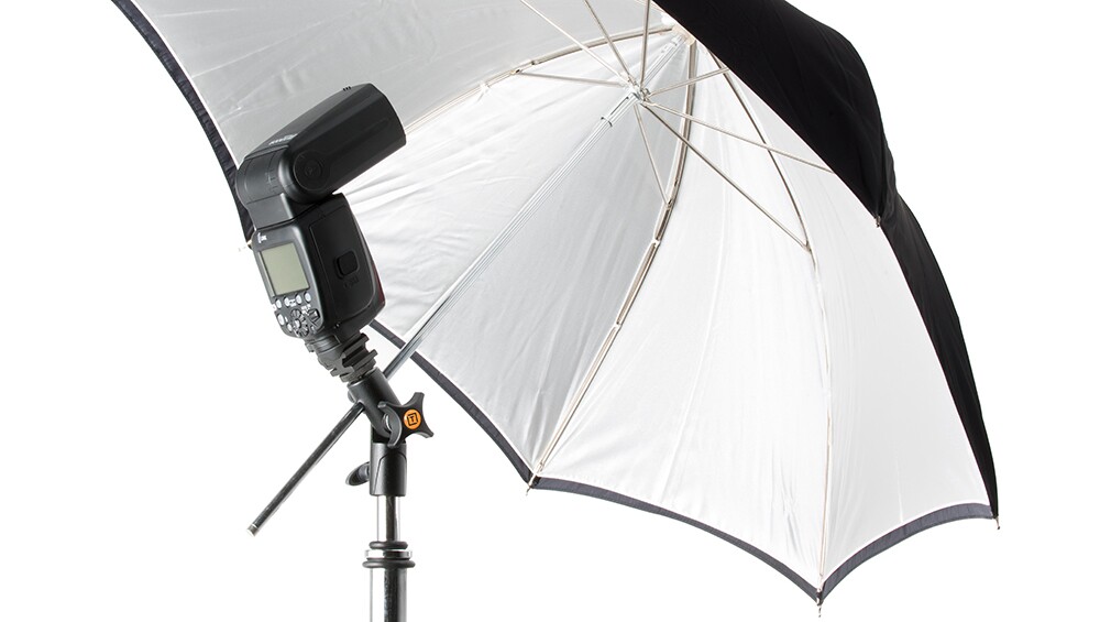 The umbrella mount allows for photographers to easy set up lighting scenes that include big soft lighting (umbrella not included).