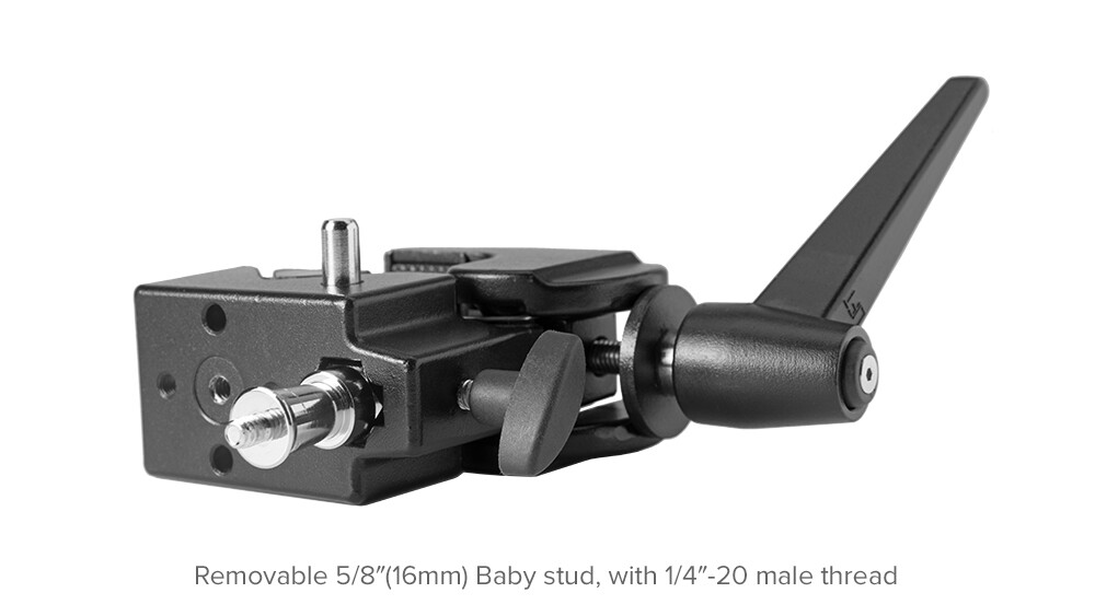 The built-in locking 5/8″(16mm) Baby socket allows for dozens of attachments and arms designed to hold cables, lights, Tether Tables, and more. The Master Clamp also includes a 5/8″(16mm) Baby stud, with 1/4″-20 male thread for added versatility.